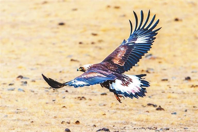 金雕以其卓越的捕獵技巧和優(yōu)雅的飛行姿態(tài)而聞名,主要棲息于高山草原、森林及河谷地帶。在祁連山遼闊的草原之上,金雕展開它那寬闊且有力的雙翅,在藍(lán)天之中肆意翱翔。陽光傾灑下來,深褐色的羽毛閃爍著如同金屬般耀眼的光澤,猶如披上了一件堅不可摧的鎧甲,威風(fēng)凜凜。它那犀利的眼神,仿佛能夠穿透重重迷霧,洞察這片廣袤土地上的每一個細(xì)微變化,盡顯王者風(fēng)范。它身姿雄偉而威嚴(yán),宛如一位至高無上的王者,向整個世界展示著它那不容小覷的力量與威嚴(yán),默默地守護(hù)著這片廣袤無垠的草原天地。