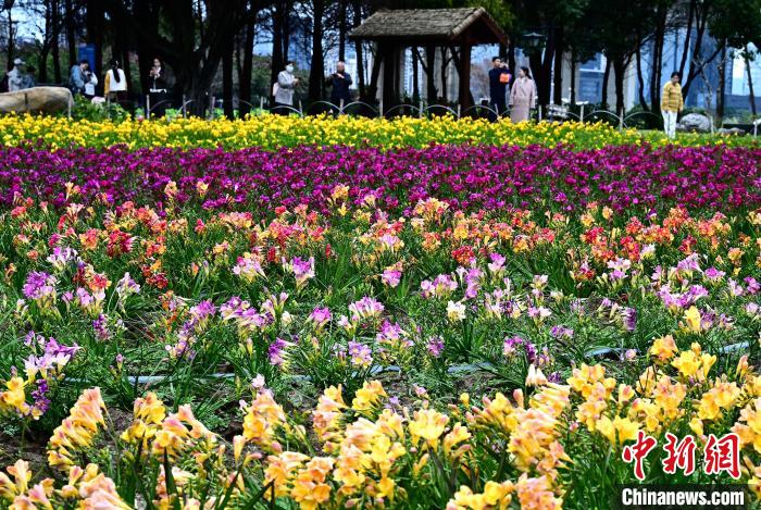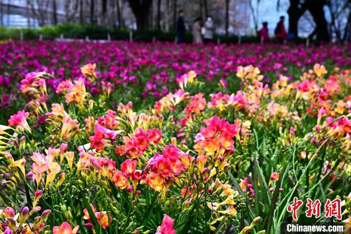 3月16日,游客在公園觀賞小蒼蘭。春日,福州花海公園魯冰花、小蒼蘭、油菜花等鮮花盛放,吸引了許多民眾前來漫步賞花,享受春天美好時光。中新社記者 張斌 攝