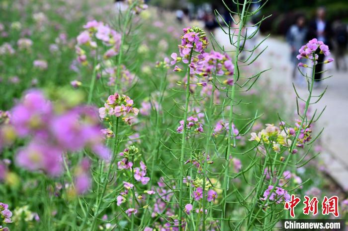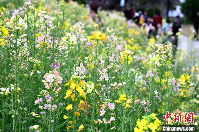 3月16日,游客在公園觀賞彩色油菜花。春日,福州花海公園魯冰花、小蒼蘭、油菜花等鮮花盛放,吸引了許多民眾前來漫步賞花,享受春天美好時光。中新社記者 張斌 攝