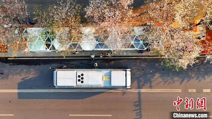 3月26日,被譽(yù)為武漢“最美櫻花車站”的珞喻東路大黃村公交站櫻花盛放。經(jīng)過(guò)改造的大黃村公交站,新增了自助售貨機(jī)、衛(wèi)生間、共享充電寶等便民設(shè)施,煥然一新的科技智慧站臺(tái)與粉白如霞的櫻花相映生輝。微風(fēng)吹過(guò),櫻花花瓣浪漫飄零,吸引不少市民游客觀賞“打卡”。圖為公交車在珞喻東路大黃村公交站停留。(無(wú)人機(jī)照片)劉康 攝