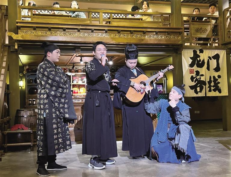 “諸位小友近來可好?”“好!”在街區(qū),NPC們與游客的互動成為一大亮點(diǎn)。為了讓游客更好地沉浸其中,街區(qū)里的“蘭裳閣”專門提供服裝出租和妝造設(shè)計(jì)服務(wù)。游客們在這里換上漢服、做好造型,“穿越”成古人與NPC們共同沉浸在這場歷史旅行中。張偉彥在“龍門客棧”工作快半年了,飾演店小二馬一刀。他對角色有著自己的理解:“導(dǎo)演讓我演店小二,大家印象里店小二都是機(jī)靈、腿腳快的。但我演的這個(gè)店小二帶著江湖氣息,他藏在龍門客棧,其實(shí)是個(gè)刀客,在這里打工是為了打探消息,畢竟龍門客??墒墙⒌木奂?。”記者走在街區(qū),時(shí)不時(shí)就能看到他拿著草帽,熱情地招呼游客玩接帽子游戲。遇到靦腆不敢嘗試的游客,他也會不斷鼓勵,有時(shí)候碰上外國游客,他還隨口說幾句英語與其互動。