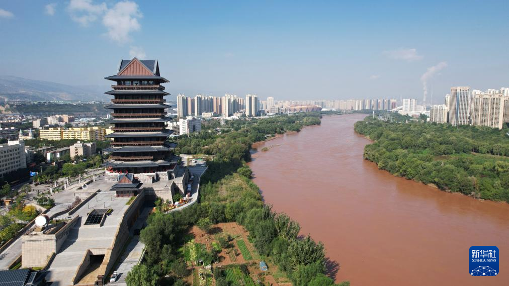 這是位于黃河蘭州段南岸的黃河樓(2024年9月26日攝,無(wú)人機(jī)照片)。新華社記者 陳斌 攝