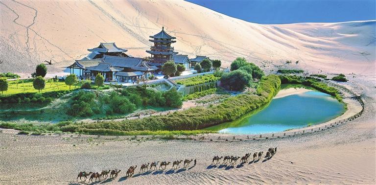 鳴沙山以沙山稱奇,多變的沙丘是其更具魅力的體現(xiàn)。在風(fēng)的不斷作用下,使得鳴沙山保持其特有的高度和形式。也正是因?yàn)轱L(fēng)的作用,不同的物質(zhì)在鳴沙山聚集,形成了特有的黑、綠、紅、黃、白五種顏色不同的沙子。而月牙泉就是被鳴沙山包圍,因沙泉相擁千年不涸而聞名于世,坐落在兩個古老沖積扇之間的月牙泉,由于地下水不斷流出松散沉積層形成泉,逐漸演化成世界地質(zhì)遺跡奇觀。