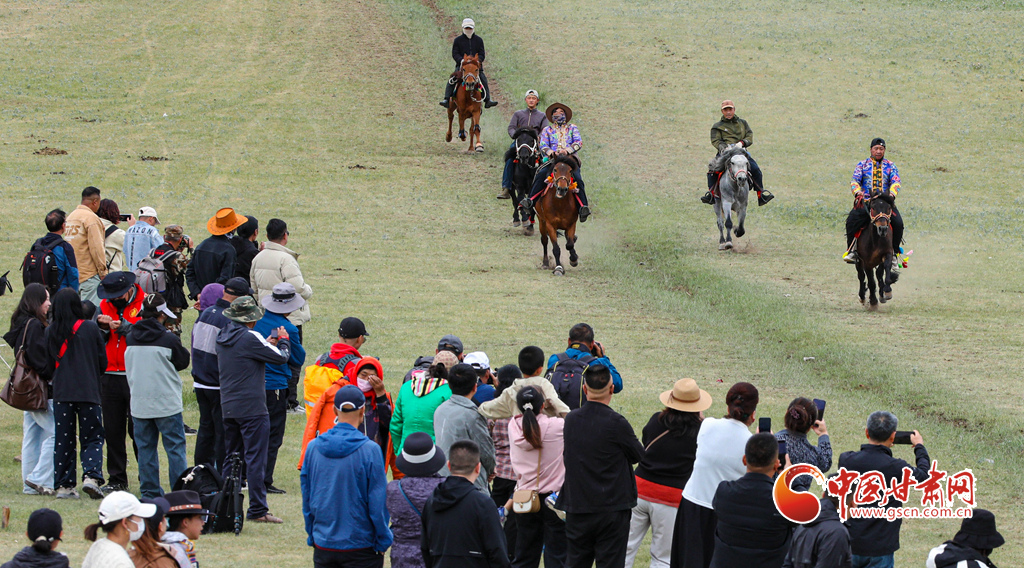 6月21日,甘肅省張掖市肅南裕固族自治縣康樂草原上,騎手們策馬揚鞭,裕固大營賽馬場展開了一場民族賽馬的激烈角逐,引得游客們陣陣喝彩。