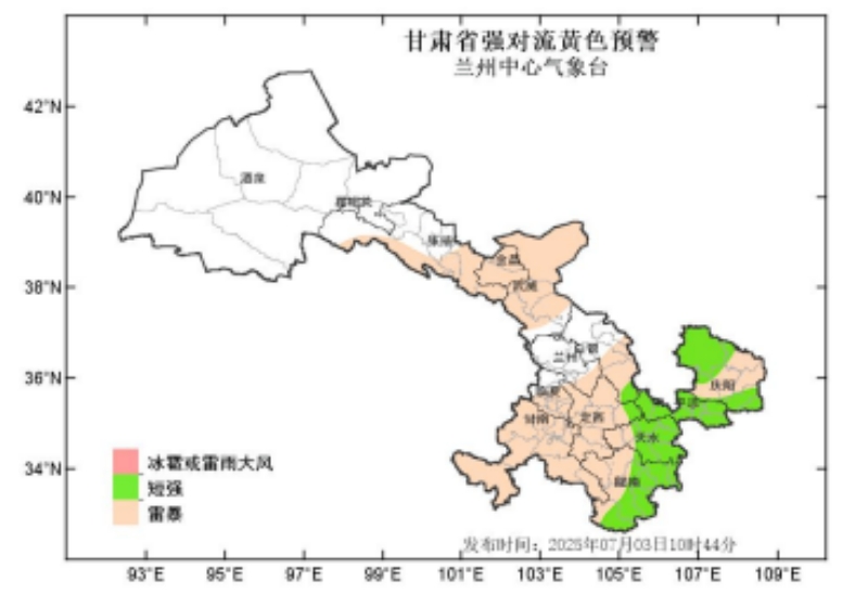 蘭州中心氣象臺2025年7月3日10時44分繼續(xù)發(fā)布強對流黃色預警:預計未來24小時,張掖、金昌、武威、蘭州、白銀、甘南、臨夏、定西、隴南、天水、平?jīng)觥c陽等州市有雷暴,其中隴南、天水、平?jīng)觥c陽等市部分地方及白銀、定西兩市局部地方有短時強降水,最大小時雨強20-60mm;隴南、天水、平?jīng)?、慶陽等市強降水在未來24小時內(nèi)多發(fā),白銀、定西主要強降水時段在4日2-8時。請注意防范!