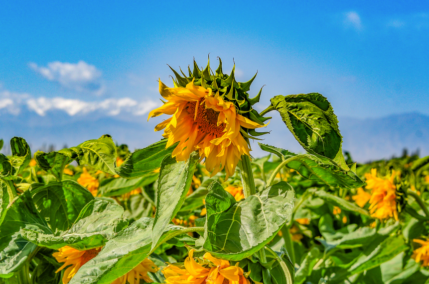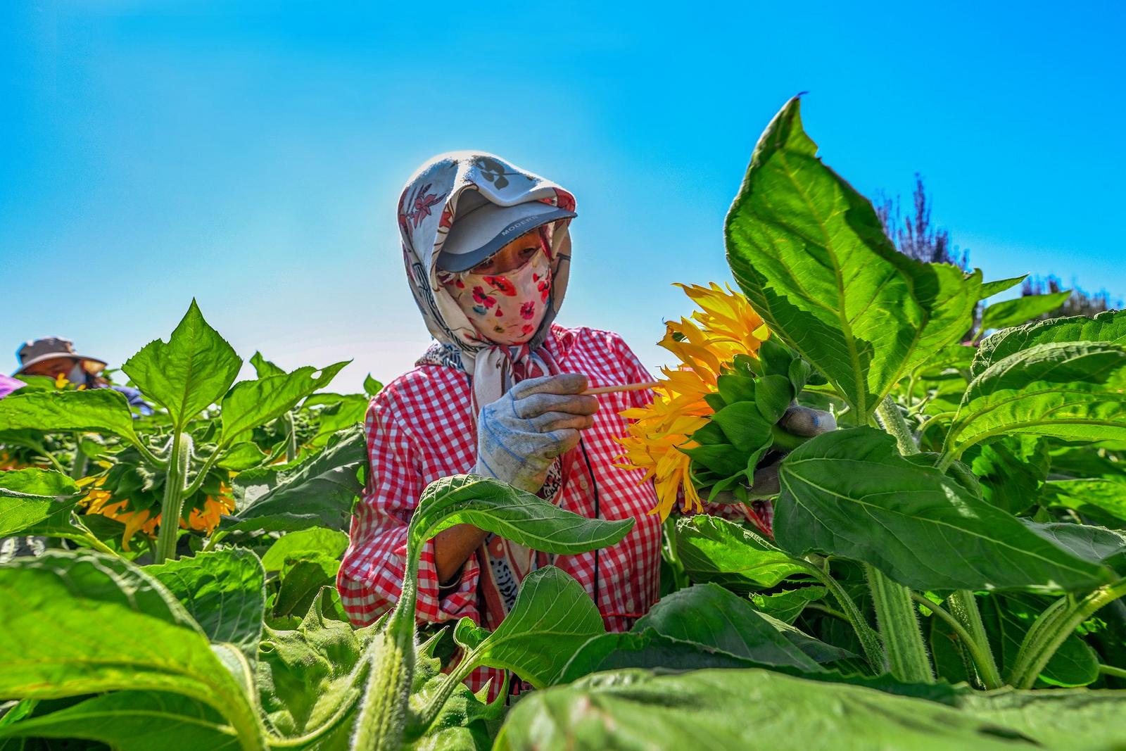 中國(guó)甘肅網(wǎng)7月14日訊 據(jù)嘉峪關(guān)日?qǐng)?bào)報(bào)道(融媒體中心記者 李巍 攝)近日,嘉峪關(guān)市新城鎮(zhèn)野麻灣村“千畝”制種向日葵迎來盛花期,朵朵花盤匯聚成金色花海,放眼望去,與雪山相融、與藍(lán)天相接,如詩如畫,美不勝收。