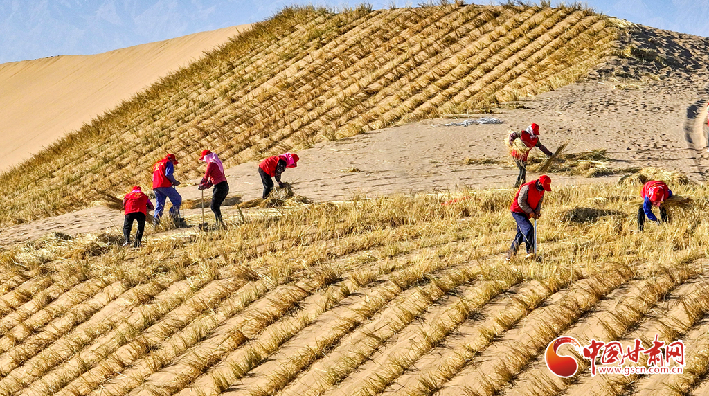 連日來,在張掖市肅南裕固族自治縣明花鄉(xiāng)西南部的干旱荒漠區(qū),運(yùn)草車輛往復(fù)穿梭,1600余名治沙工人于巴丹吉林沙漠西南緣的沙丘間忙碌作業(yè)。他們劃線、背草、俯身鋪草、揮鍬壓埋,全力營(yíng)建沙障與固沙林帶,為沙漠牢牢“鎖邊”。