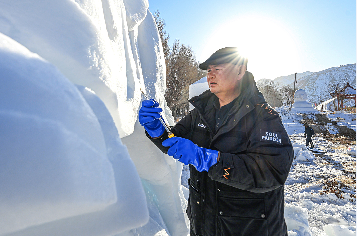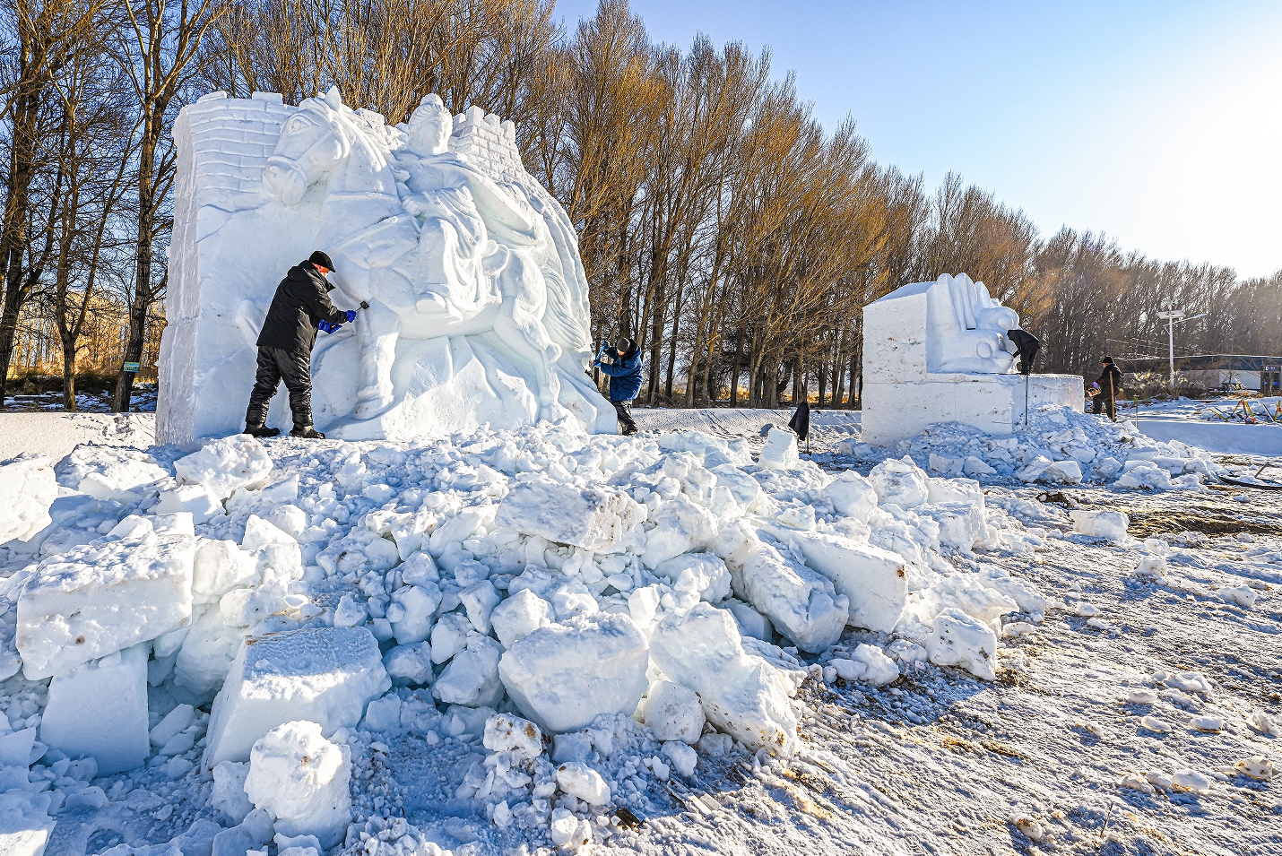 中國甘肅網(wǎng)1月13日訊 據(jù)嘉峪關日報報道(融媒體中心記者 李巍 攝)揚鏟塑造型,落刀雕精彩。1月10日,懸壁長城腳下,《昭君出塞》《九尾靈狐》《喜財神》等雪雕作品,在匠人們的精雕細琢中漸漸揭開“面紗”。
