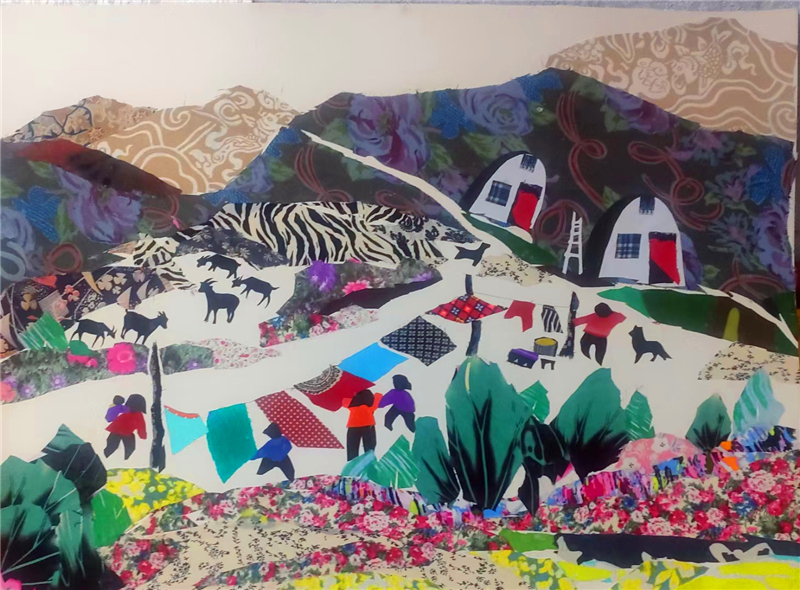 裁剪環(huán)節(jié)更見(jiàn)功力。她以“銳利”之心駕馭剪刀,根據(jù)畫面需求將碎布剪成不同形狀,有的需棱角分明,有的要圓潤(rùn)柔和。粘貼時(shí),她摒棄簡(jiǎn)單的粘合方式,采用傳統(tǒng)縫補(bǔ)與現(xiàn)代鑲嵌相結(jié)合的技法,讓布料與底板緊密貼合,既保證了作品的耐久性,又營(yíng)造出自然的浮雕感。在《黃土風(fēng)情》布貼畫中,她用層層疊疊的碎布表現(xiàn)黃土高原的溝壑縱橫,用深淺不一的色塊勾勒窯洞的錯(cuò)落有致,指尖翻飛間,碎布頭便有了筋骨與神韻。