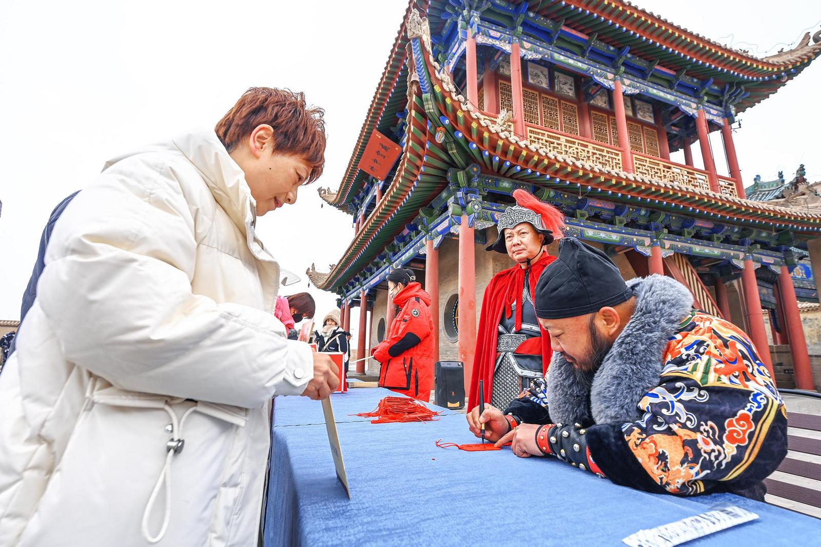 “關(guān)長(zhǎng)”為游客現(xiàn)場(chǎng)書(shū)寫“福”牌。