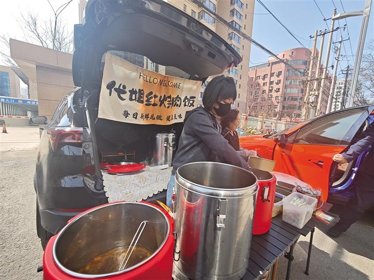 上午11時(shí)20分,甘南路民族飯店門(mén)口的人行道上,一輛簡(jiǎn)易流動(dòng)餐車準(zhǔn)時(shí)支起攤位。不銹鋼餐盆里,色澤鮮亮的炒肉片蓋飯熱氣升騰,濃郁香氣順著風(fēng)飄向周邊寫(xiě)字樓,短短幾分鐘,攤位前就排起了七八人的小長(zhǎng)隊(duì)。“老板,一份炒肉片蓋飯,多放青椒和咸菜!”“我要兩份,打包帶走!”熟練打飯、快速裝盒、掃碼收款,一氣呵成,不到20分鐘,桶里的米飯就下去了小半桶。