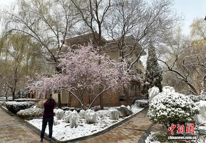 3月14日,蘭州主城區(qū)迎來(lái)降雪,市民拍攝雪景。中新社記者 丁思攝