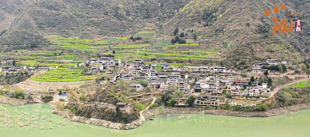 那一叢叢、一簇簇的油菜花,沿著梯田層層疊疊,從江邊一直蔓延到半山腰,鋪展在青山碧水之間;又像是大地剛剛蘇醒時(shí),打翻的調(diào)色盤(pán)。