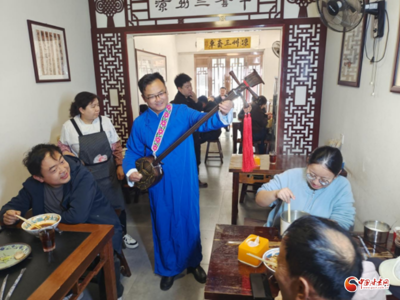 當(dāng)日,北關(guān)市場(chǎng)內(nèi)人流如注、熙熙攘攘,眾多游客與市民齊聚于此,享受美味的同時(shí)觀看涼州賢孝和永昌滾燈,涼州賢孝傳承人賈旭峰與用餐的游客進(jìn)行了互動(dòng),人們安逸地享受著這份獨(dú)具涼州特色的煙火美味。