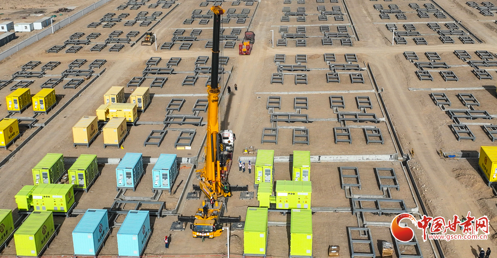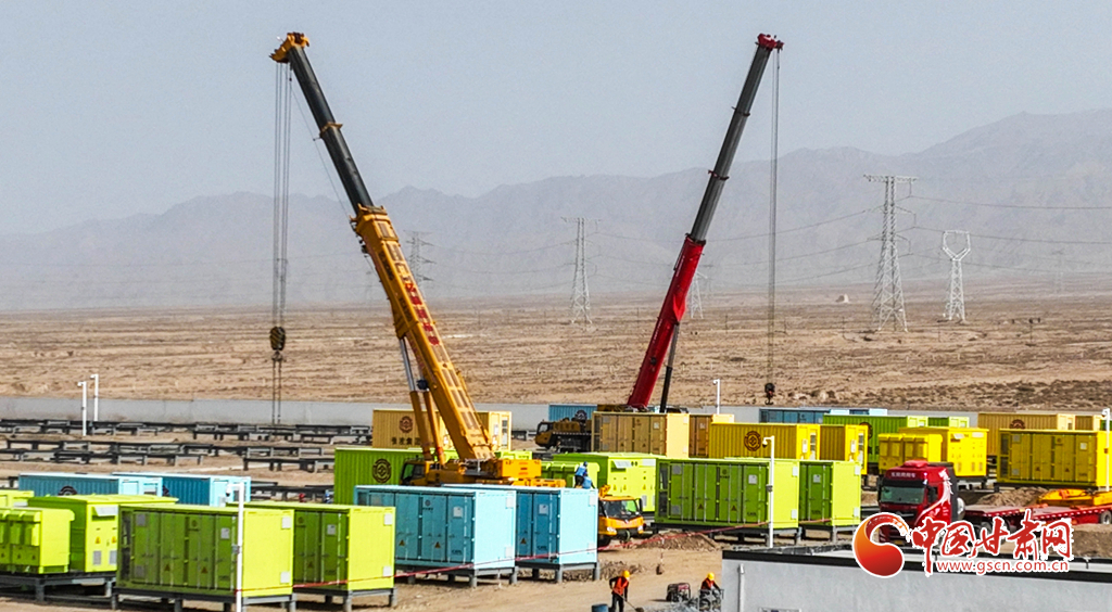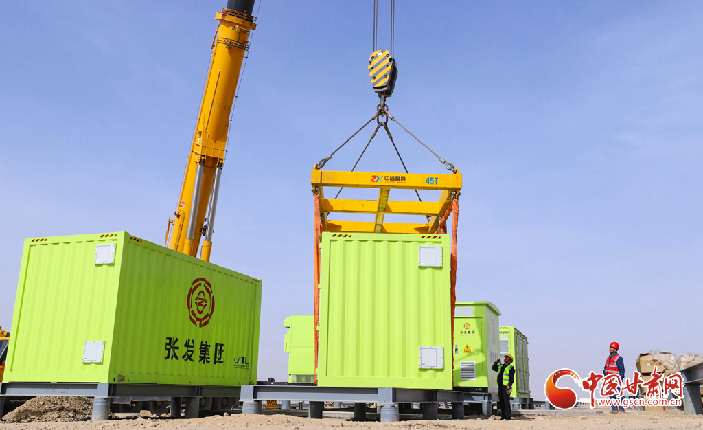 3月19日,張掖市山丹縣東樂灘上,工程建設者們正在進行儲能電站項目電池倉吊裝前的準備。