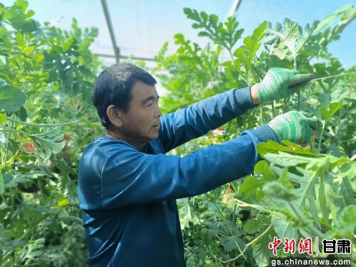 圖為瓜農(nóng)對大棚西瓜進(jìn)行精細(xì)化管護(hù)。楊燕 攝